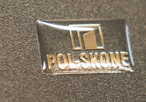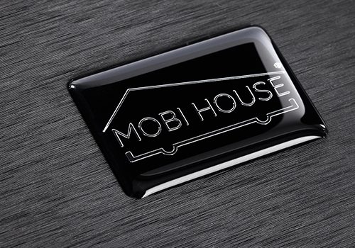 Markenbutton mit 3D Optik klar, Logo in silber auf schwarzem Hintergrund, Beispiel 020