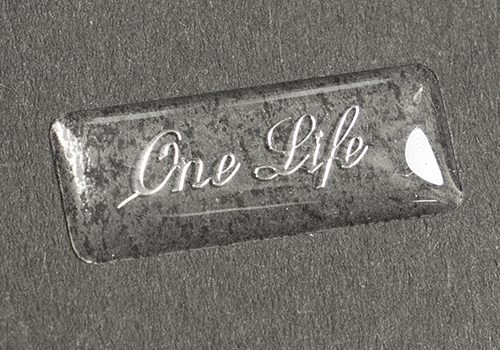 Markenbutton 3D klar, Schriftzug in Metalloptik, die Struktur des Untergrundes wird durch die klare 3D Optik verstärkt, Beispiel 022