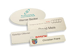 Gravierte Namensschilder sind nicht nur eine Wertschätzung für alle Mitarbeiter, sie sind besonders unverwüstlich. Die kratz- und lösungsmittelresistente Oberfläche ist lange haltbar, sodass der Namenszug jederzeit erkennbar bleibt. Ebenfalls sicher vor äußeren Einflüssen sind die Namensschilder aus Metall (mit und ohne Logoaufdruck), bei denen die Papiereinlage hinter einer dünnen Hartfolie liegt. Namensschilder aus Acryl mit rückseitigem Logo- und Namensdruck werden besonders gern in medizinischen Einsatzbereichen genutzt.